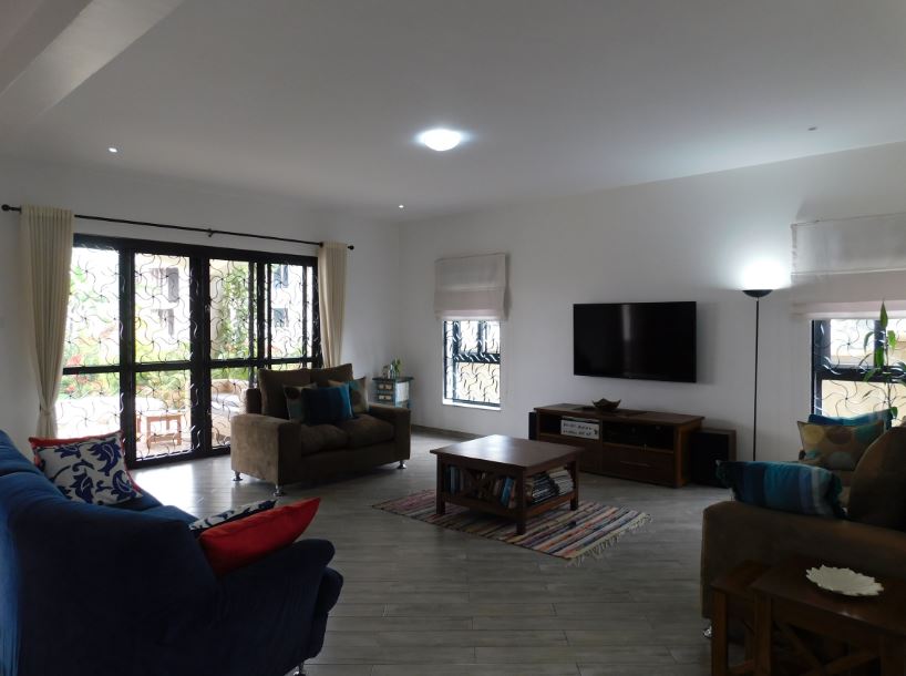 • Elegant living room with Italian tiled floors with access to the patio and garden